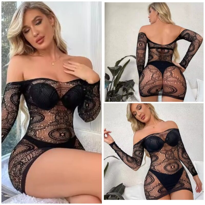 Black Stocking Fishnet Off-Shoulder Bodysuit 8558