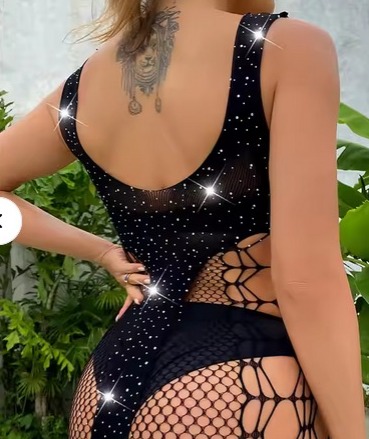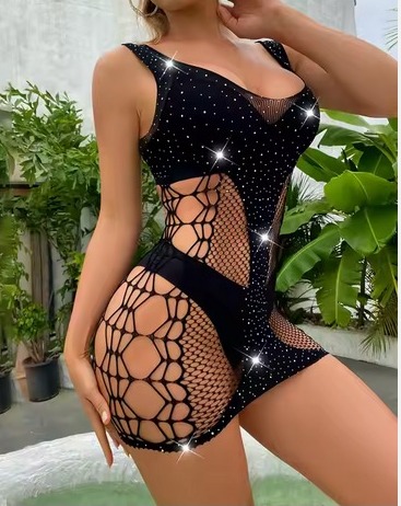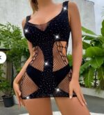 This sleeveless mesh dress blends solid black panels with fishnet-style mesh and sparkly embellishments for a bold, glamorous look.