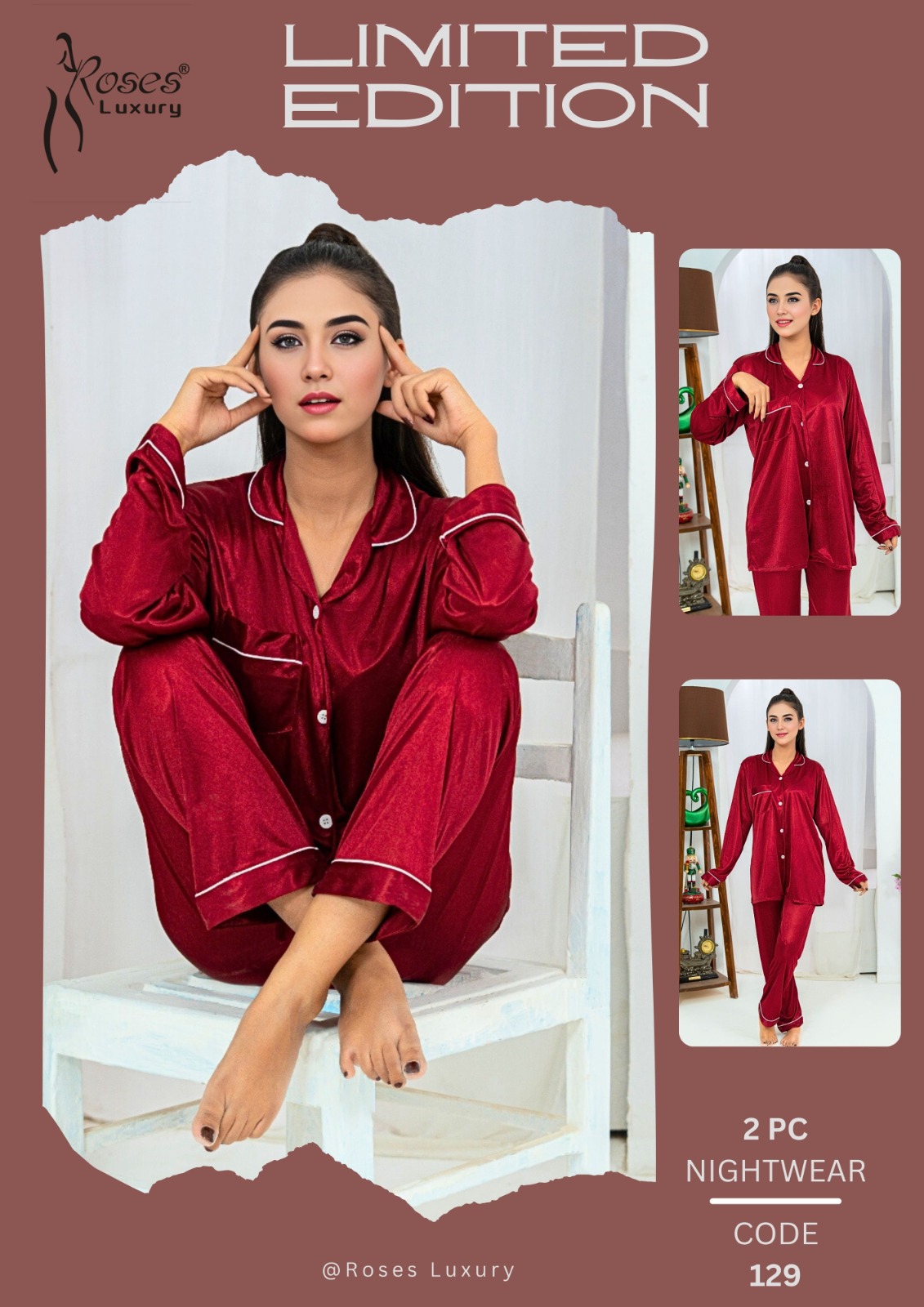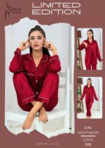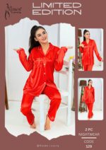 Upgrade your nighttime style with this limited edition red satin nightwear set from Roses Luxury. Featuring a full-sleeve button-up top and matching pants with white piping, this ensemble blends comfort, elegance, and premium presentation.